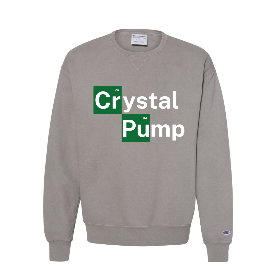 Instead of going on Alibaba and ordering the cheapest option to shill to people for a 700% markup, Crystal Pump crew necks are printed on Champion sweatshirts for a durable piece with a comfortable fit.